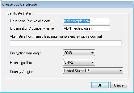When creating a certificate, enter the host name to which your users will connect (for example, "mail.example.com").
