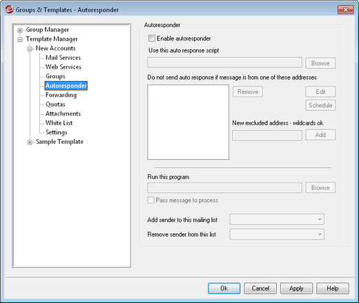 The options on this template screen correspond to the options located on the Account Editor's Autoresponder screen. When a template is set to control this screen, it will control the Autoresponder options for any account belonging to a Group that utilizes the template.