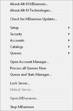 Right click on MDaemon's tray icon to open the shortcut menu. This menu gives you quick access to virtually all of MDaemon's menus without having to open the main user interface. Click the "About Alt-N..." options in the top section of the shortcut menu to find out more about MDaemon or Alt-N Technologies. In the next section, click "Check for MDaemon Updates..." to see if there is a newer version of MDaemon available for download. In the third section you can access the following MDaemon menus: Setup, Security, Accounts, Lists, Gateways, Catalogs, and Queues. Each of these cascading menus is identical to the menu of the same name located on the menu bar of the main interface. The fourth section has options to open the Account Manager and Queue and Statistics manager, and one that will cause all of MDaemon's mail queues to be processed. Next, there are commands to lock and unlock MDaemon's interface (See "Locking/Unlocking MDaemon's Main Interface" below) followed by the "Open MDaemon..." menu selection, used for opening/restoring MDaemon's interface when it is minimized to the system tray. The last option is "Shut down MDaemon," which is used to quit MDaemon or shut down its system service (the service settings are not changed—the MDaemon service is merely stopped). |