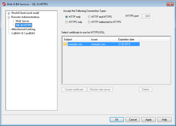 This screen only applies to Remote Administration when using MDaemon's built-in web server. If you configure Remote Administration to use some other web server such as IIS, these options will not be used — SSL/HTTPS support will have to be configured using your the other web server's tools. |