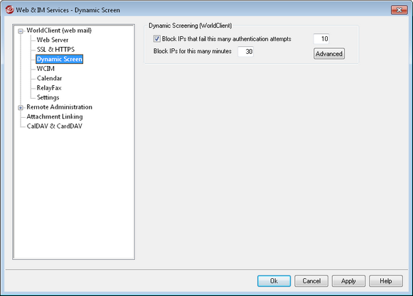 Use this option if you wish to temporarily block IP addresses that fail a WorldClient authentication attempt a specified number of times. This can help prevent attempts to "hack" a user account and falsely authenticate a session. This option monitors only WorldClient connections.