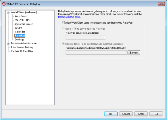Click this option to integrate RelayFax with WorldClient. When active it will cause a "Compose Fax" control and other fax related features to appear on the WorldClient pages.