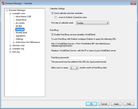 This screen controls MDaemon's Calendar features for this domain. The initial settings on this screen are determined by the Calendar screen located on the Web & IM Services dialog.