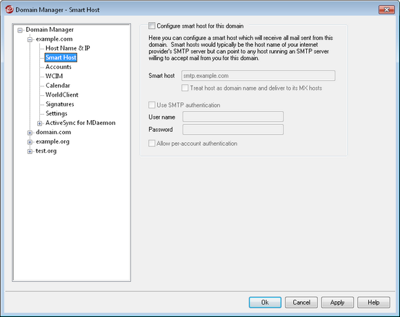 If you wish to route this domain's outbound mail through a specific Smart Host rather than using MDaemon's default Delivery options, enable this checkbox and specify the smart host below. All of the domain's outbound mail will be routed to the host.