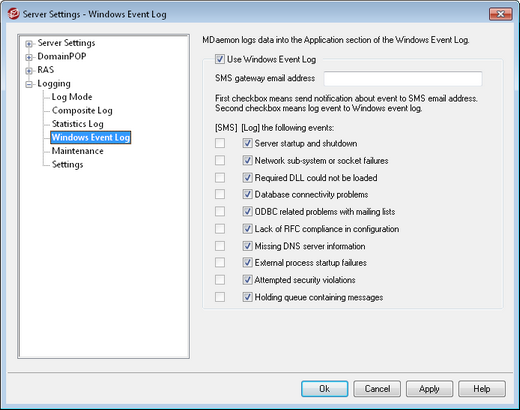 Use the SMS options to designate the events you wish to send to a device via text message. Use the Log options to designate the events that you wish to log to the Application section of the Windows Event log. To send SMS messages you must specify the email address of your phone carrier's email-to-SMS gateway in the option above. Further, any event that triggers a notification message to the SMS gateway will cause the remote queue to be processed; the notifications will be treated as and "urgent" email.