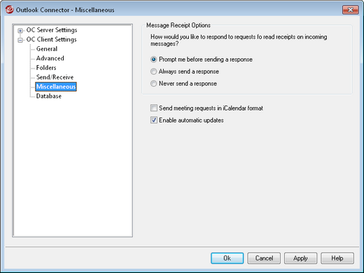 Sometimes incoming messages contain a special header for requesting that an automated message be sent back to the sender to let him or her know when you read the message. Set this option to specify how you want Outlook Connector to handle messages that ask for read confirmations.