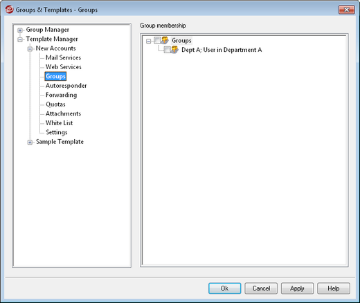 This screen corresponds to the Group Membership section of the Account Editor's Mail Folder & Groups screen. Any account that is a member of a group that is linked to this template will have its group memberships determined by the template rather than the account settings. If an account belongs to multiple groups linked to different templates, then all of the templates will be used wherever there are no conflicts in the designated Template Properties. If multiple templates are set to control the same properties, then the first template listed is the one that will be used.