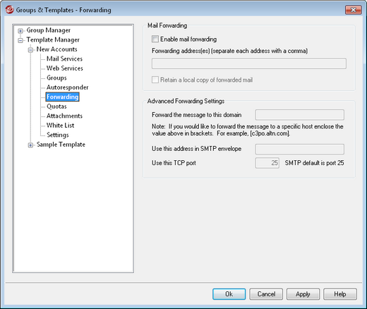 The options on this template screen correspond to the options located on the Account Editor's Forwarding screen. When a template is set to control this screen, it will control the Forwarding options for any account belonging to a Group that utilizes the template.
