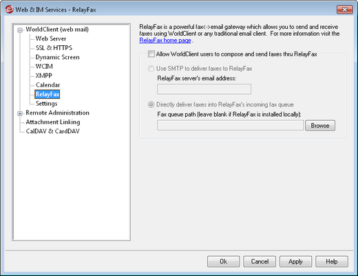 Click this option to integrate RelayFax with WorldClient. When active it will cause a "Compose Fax" control and other fax related features to appear on the WorldClient pages.