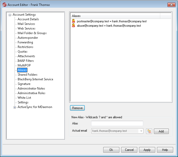 To add a new alias to the account, in the Alias box type the address that you wish to associate with the account and then click Add. The wildcards "?" and "*" are permitted, representing single characters and single words, respectively.