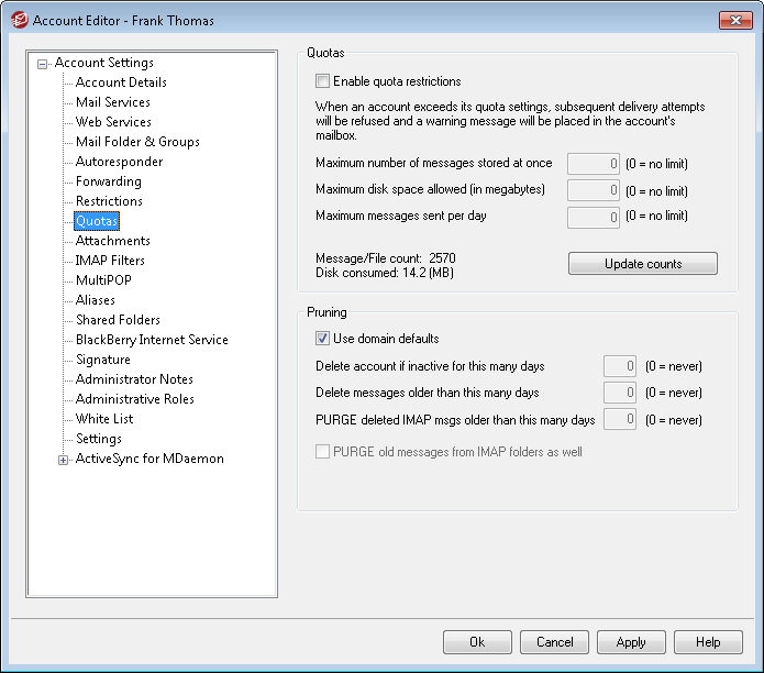 Use this option to designate the maximum amount of disk space that the account can use, including any file attachments that may be stored in the account's Documents folder. Using "0" in the option mean there will be no limit to the amount of disk space that the account can use.
