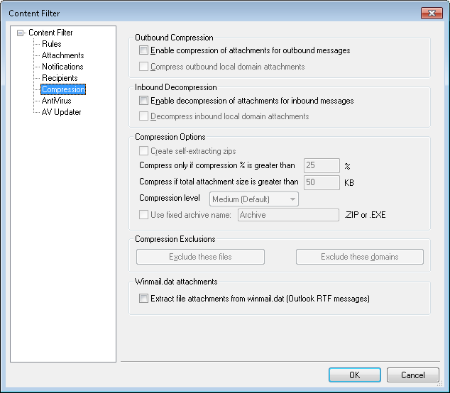 With the controls on this tab you can cause message attachments to be automatically compressed or decompressed before the message is delivered. The level of compression can be controlled as well as several other parameters and exclusions. This feature could significantly reduce the amount of bandwidth and throughput required to deliver your outbound messages.