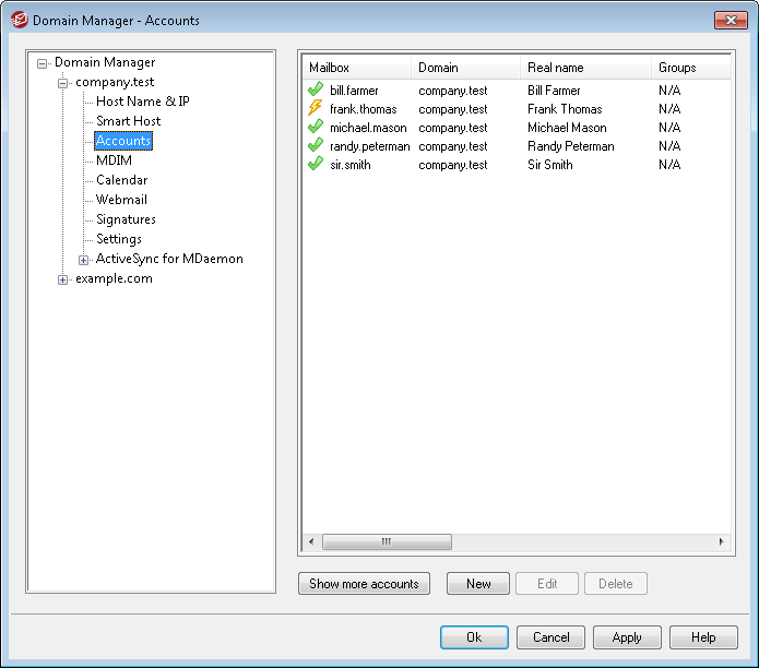 The Accounts page displays a list of all of this domain's MDaemon accounts. Each entry in the list contains Account Status Icons (see below), the mailbox, the "real name" of the account holder, any groups to which the account belongs, the message count, and the amount of disk space used (in MB). This list can be sorted in ascending and descending order by whichever column that you prefer. Click any column heading to sort the list in ascending order by that column. Click the column again to sort it in descending order.