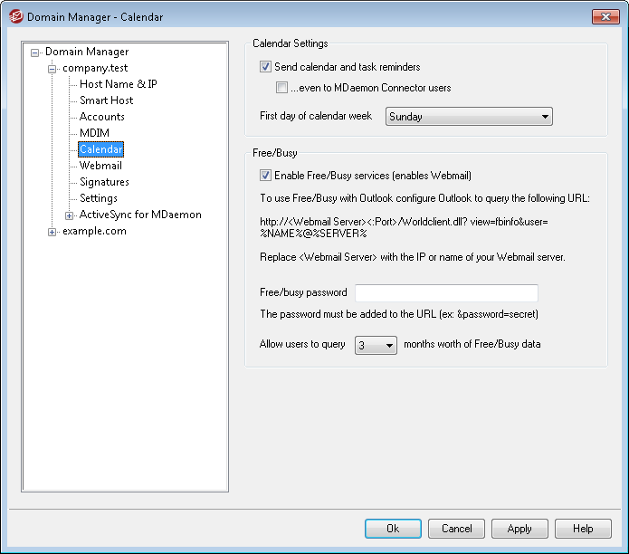 This screen controls MDaemon's Calendar features for this domain. The initial settings on this screen are determined by the Calendar screen located on the Web & IM Services dialog.