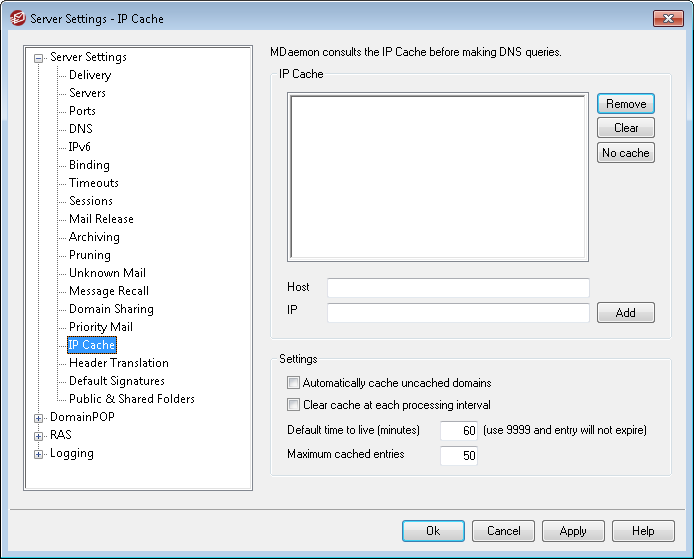 In order to speed message delivery and shorten mail processing time, MDaemon caches the IP addresses of all hosts with which it comes in contact. These IPs are stored and then the cache is checked each time MDaemon requires a DNS resolution on a host name. If the host name needing resolution is found in the IP cache then the DNS lookup is skipped, which can save a surprising amount of processing time. The settings in this window allow you to manipulate the parameters under which the cache will operate. You may also manually add and remove entries, set the maximum size of the cache, and designate how long entries will remain cached. The IP Cache can be reached from the "Setup » Server Settings » IP Cache" menu selection.