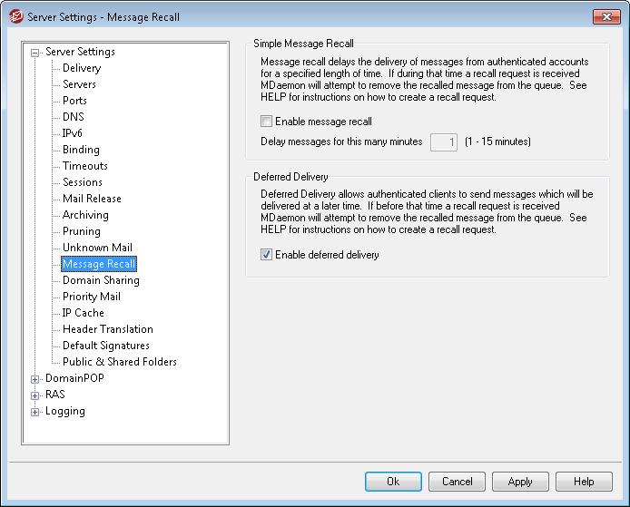This is the number of minutes that MDaemon will hold incoming messages from authenticated local users. If a RECALL message is received during the delay period then MDaemon will delete the referenced message. This option can be set to 1-15 minutes. 1 minutes is the default setting.