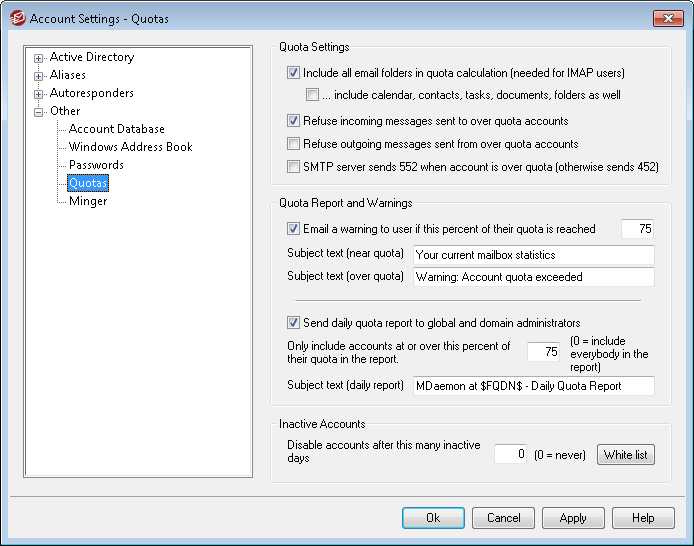 Check this box and specify a value if you wish to send a daily quota report to all global and domain administrators. The report will contain quota statistics for all users at or over the designated percentage of their quota restriction. Use "0" as the value if you want the report to include quota statistics on everyone.