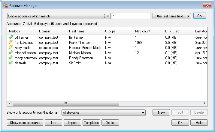 Above the list of accounts you will see two statistics regarding the list. The first number is the total number of MDaemon user accounts that currently exist on your system. The second number is the number of those accounts currently displayed in the list. The accounts that will be displayed is contingent upon what you have chosen in the Show only accounts from this domain option below the list. If you have selected "All Domains" then all of your MDaemon accounts will be displayed in the list. There is a search option at the top of this dialog that you can use to define exactly which accounts will be displayed beyond simply the domain to which they belong.