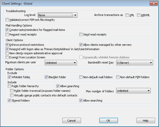 Similar to Policies, which are assigned to the device and generally govern what the device can do, Client Settings govern what the server will do with regards to various client-related options, such as: governing how many separate ActiveSync clients an account can use, whether or not Public Folders will be synced to a device along with the account's personal folders, whether or not to include the user's whitelist folder, and so on.