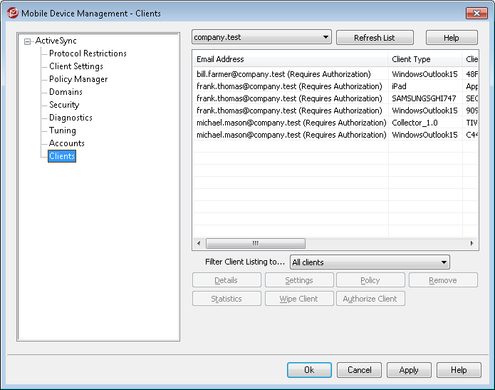 If the "New clients require administrative approval" option on the ActiveSync Client Settings screen is set to require approval, select a client and click this button to authorize it for synchronization with the server.