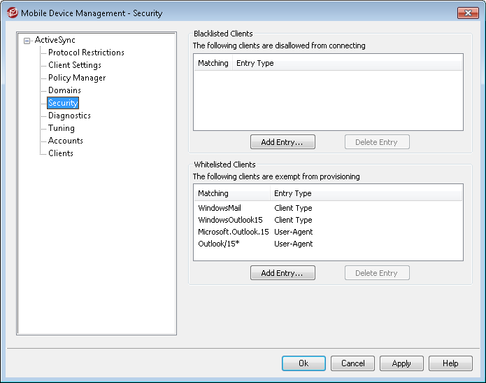To add an entry to the list, click Add Entry, specify the device info, and click Ok. You can obtain the device info from the device itself or from the ActiveSync log files if the device has connected to MDaemon's ActiveSync server.