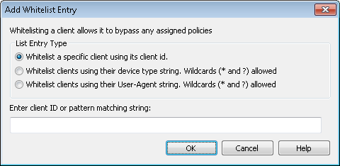 Use this option to exempt a specific Device Type, Device ID, or User Agent from provisioning, or policy restrictions.