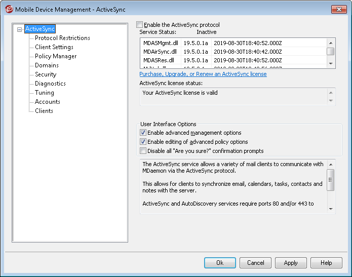 By default the Diagnostics and Tuning screens are hidden from the navigation pane on the left side of the Mobile Device Managements dialog. These screens contain options governing various ActiveSync system settings and diagnostics tools, and in most cases they will rarely need to be accessed or adjusted by anyone. Enable this option if you want them to be visible.