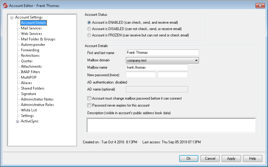 The account should have a password even if you do not wish to allow POP3/IMAP access to the mail account. In addition to mail session verification, the email address and Mailbox password values are used to allow remote account configuration and remote file retrieval. If you wish to prevent POP/IMAP access, use the options located on the Mail Services screen. If you wish to prevent all access, then use the Account is DISABLED or Account is FROZEN options above. |