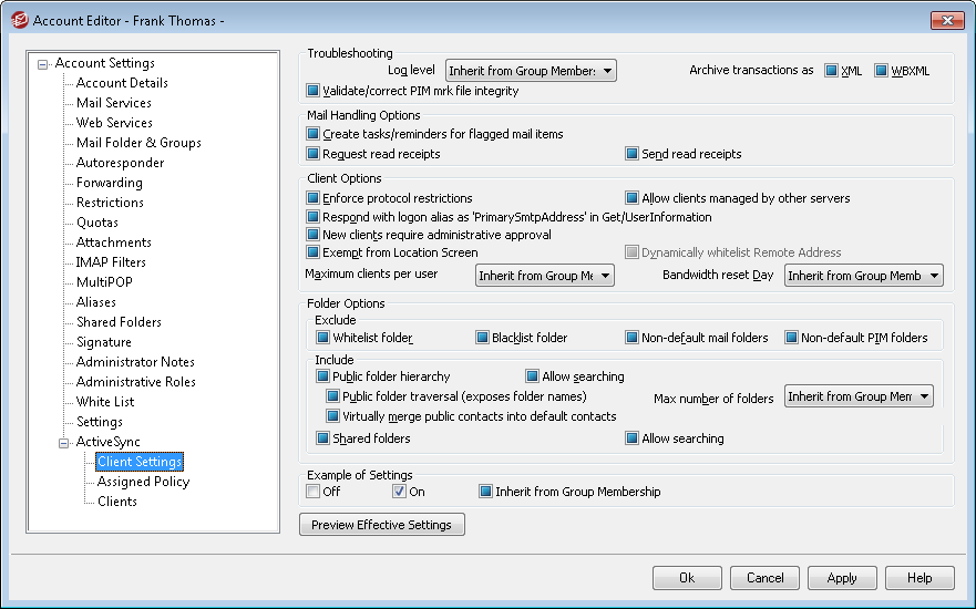 The options on this screen are used to control ActiveSync client settings for clients associated with this account. By default each of these options is configured to inherit its setting from the corresponding domain to which the account belongs. Changing any setting on this screen will override the domain setting for this account. Further, you can use the Settings option on the Clients screen if you wish to override these account-level settings for specific clients.
