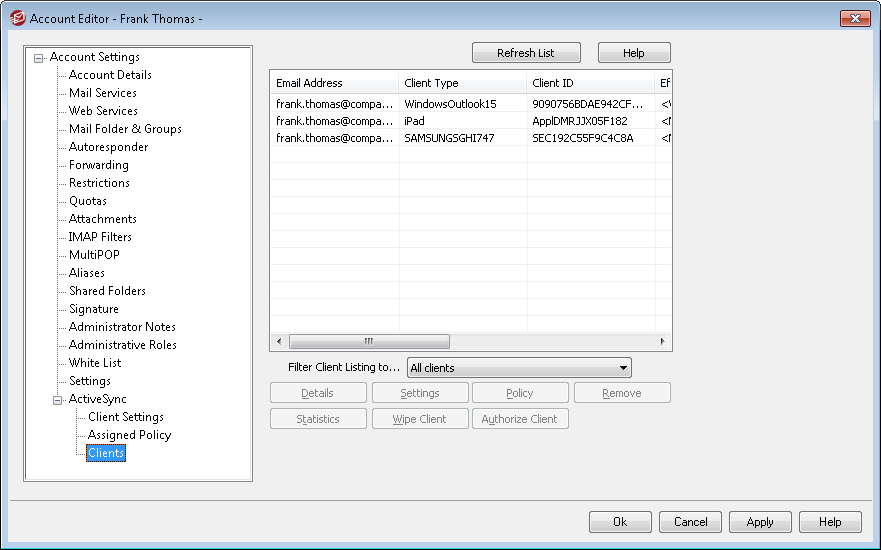 This screen displays information about any ActiveSync clients associated with the user's account. From here you can assign an ActiveSync Policy for each client, control various client settings, remove clients, remotely wipe them, and reset the client statistics within MDaemon.