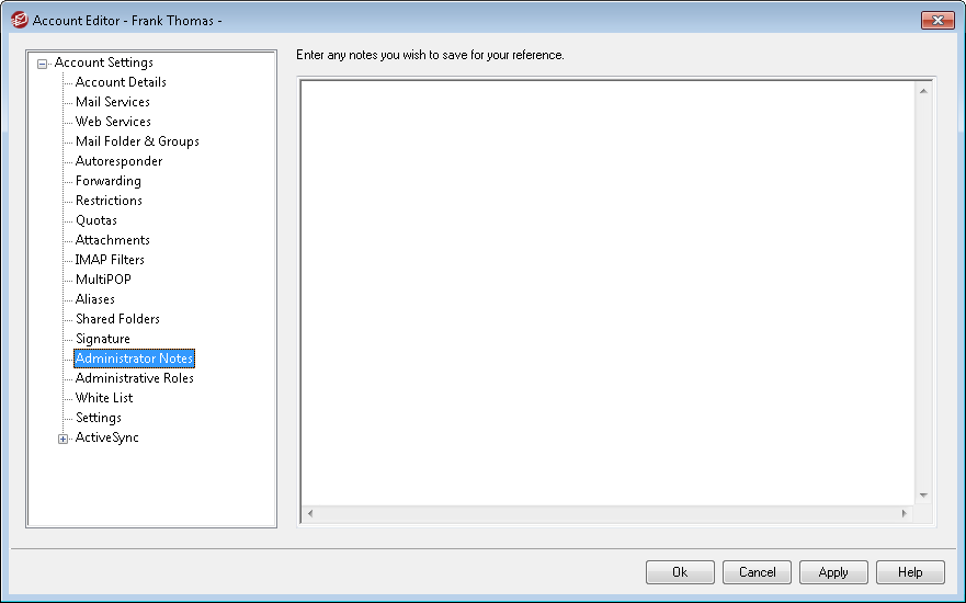 Use this screen for any notes or other information you wish to save for your own reference regarding this account. Unlike the Description field on the Account Details screen, Administrator Notes will not be synchronized to the public contacts or mapped to any field in Active Directory.