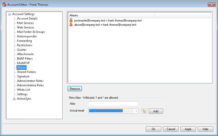 To add a new alias to the account, in the Alias box type the address that you wish to associate with the account and then click Add. The wildcards "?" and "*" are permitted, representing single characters and single words, respectively.