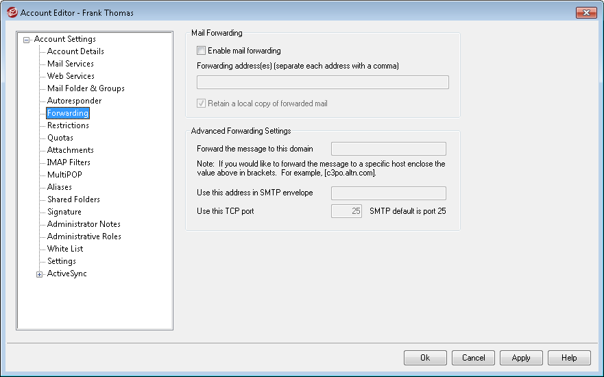 Check this box if you wish to forward this account's incoming messages to the address or addresses specified in the Forwarding addresses option below. MDaemon users with web access to Webmail or Remote Administration can use the options provided to set the forwarding options for themselves rather than requiring an administrator to do so.