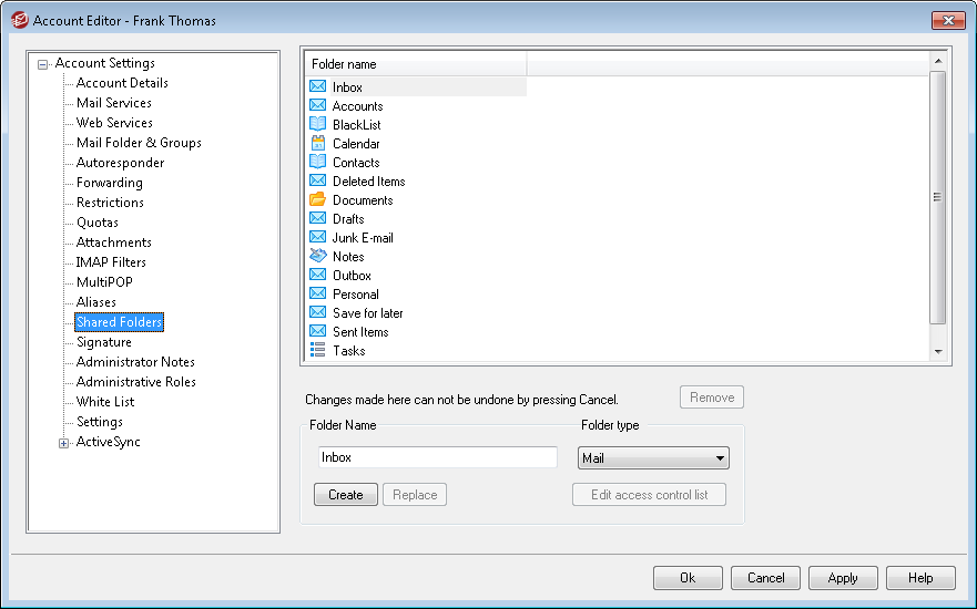 This top section displays all of the user’s IMAP Folders and can be used to share access to them with other MDaemon users or Groups. When the account is first created, this area will only have the Inbox listed until you use the Folder name and Create options (or the options on IMAP Filters) to add folders to it. Subfolders in this list will have the folder and subfolder names separated by a slash.