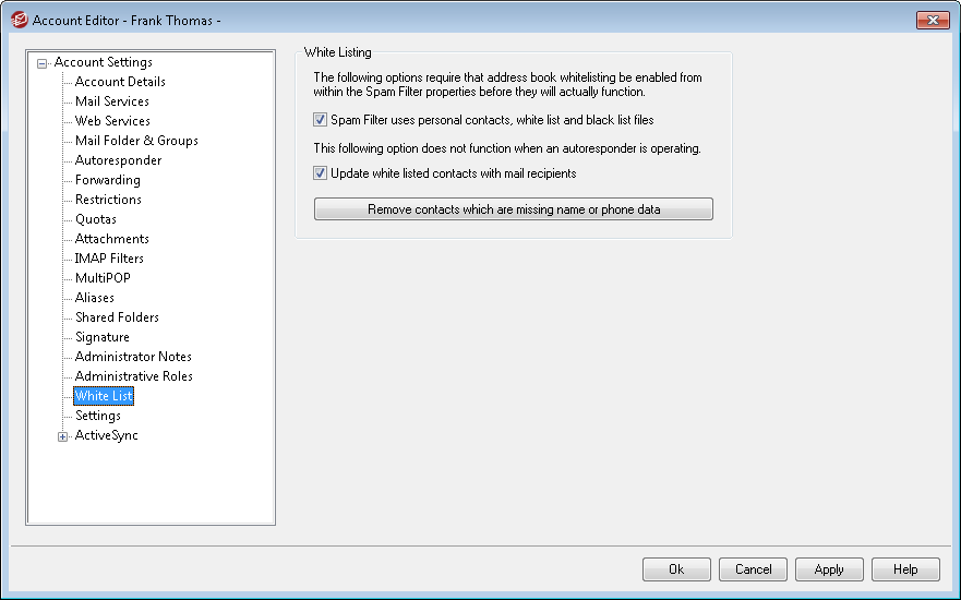 The Spam Filter's White List (automatic) screen contains a global option that can be used to cause the Spam Filter to white list a message automatically when the sender of the message is found in the local recipient's personal contacts or white list folder. It will also automatically black list a message when the sender is found in the user's black list file. If you have enabled the Spam Filter's global option but do not wish to apply it to this account, clear this check box to override the global setting. If the global option is disabled then this option will not be available.
