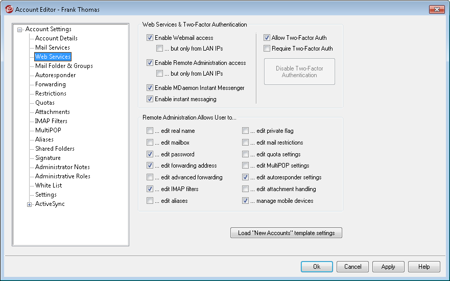Check this box if you wish to grant the user permission to modify his or her account settings via Remote Administration. The user will only be able to edit those settings that you designate below.