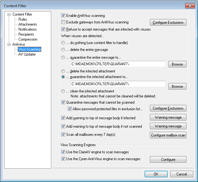 The options on this screen will only be available when using the optional MDaemon AntiVirus feature. Enabling MDaemon AntiVirus for the first time will start a 30-day trial. If you wish to purchase this feature, contact your authorized MDaemon reseller or visit: www.mdaemon.com. |