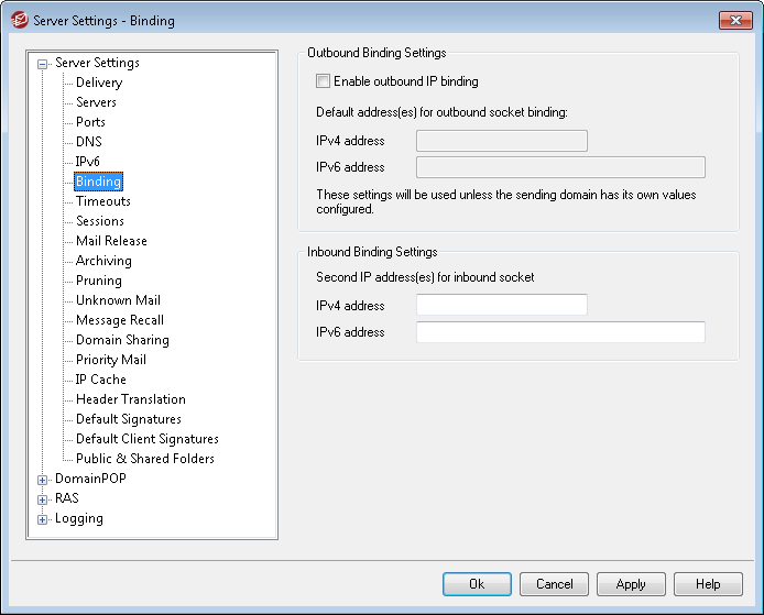 Use this option if you wish to designate a second set of IP addresses for inbound socket binding.