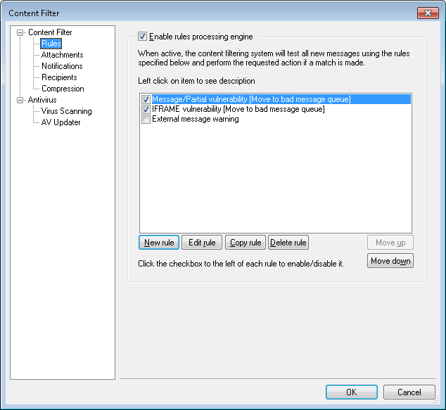 This box lists all of your Content Filter rules, with a checkbox beside each one so that you can enable/disable them at will. To see a description of any given rule in its internal script format, click that rule and pause your mouse-cursor over it (moving your mouse will cause the description to disappear). Whenever a message is processed through the Content Filter, these rules will be applied in the order in which they are listed. This makes it possible for you to arrange your rules to achieve a greater level of versatility.
