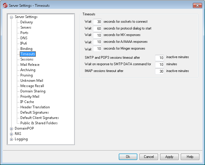 SMTP and POP3 sessions timeout after XX inactive minutes
