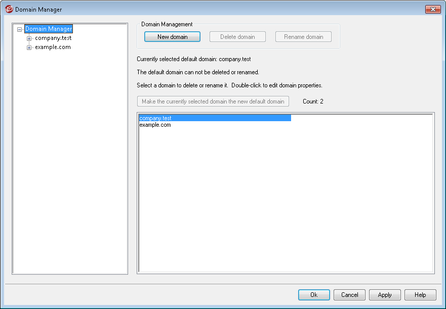 The area on the left side of this dialog contains the list of your domains, with links to each screen used for configuring the various domain-specific settings. The Default Domain is listed first and all other domains are listed alphabetically. The list on the right is used for deleting and renaming domains, and for designating the Default Domain. You can double-click a domain in this list to switch to the domain and configure its settings.