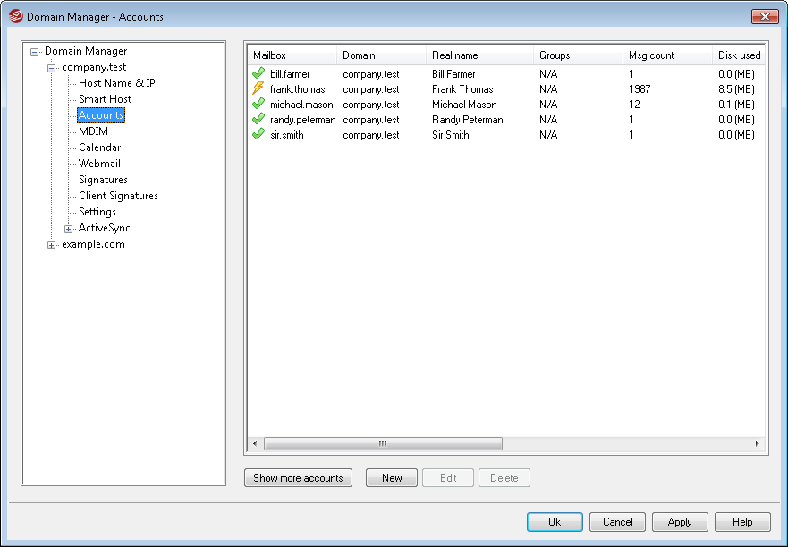 The Accounts page displays a list of all of this domain's MDaemon accounts. Each entry in the list contains Account Status Icons (see below), the mailbox, the "real name" of the account holder, any groups to which the account belongs, the message count, and the amount of disk space used (in MB). This list can be sorted in ascending and descending order by whichever column that you prefer. Click any column heading to sort the list in ascending order by that column. Click the column again to sort it in descending order.