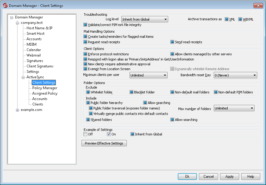 If you wish to limit the number of ActiveSync clients or devices that can be associated with an MDaemon account, specify the desired number in this option. The global option is set to "unlimited" by default. This option is available on the Global, Domain, and Account client settings screens, not the individual Clients screens.