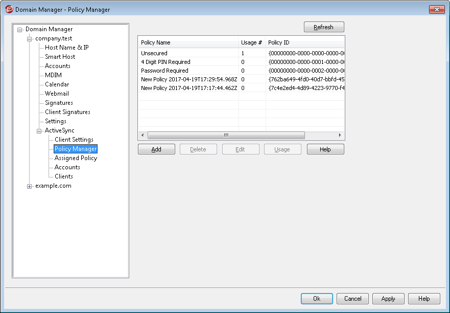 Use this screen to manage the ActiveSync Policies that can be assigned to user devices to govern various options. Predefined policies are provided, and you can create, edit and delete your own. Default and overriding policies can can be assigned to the domain and each account and client on their respective Assigned Policy screens.