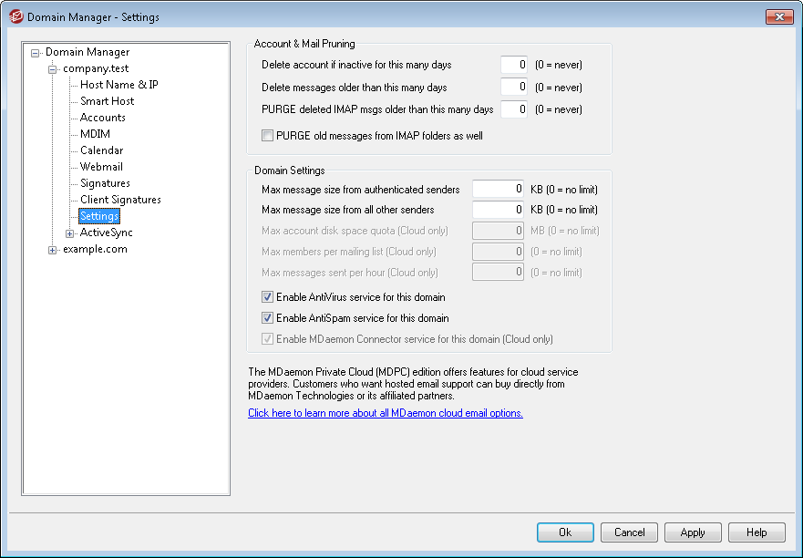 Use this option if you wish to set a limit on how much disk space the domain can use. This option is only available in MDaemon Private Cloud.