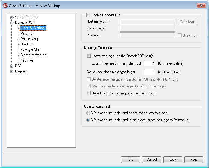 If selected, MDaemon will use the setting provided on this screen to collect mail from a DomainPOP mail host for local redistribution.