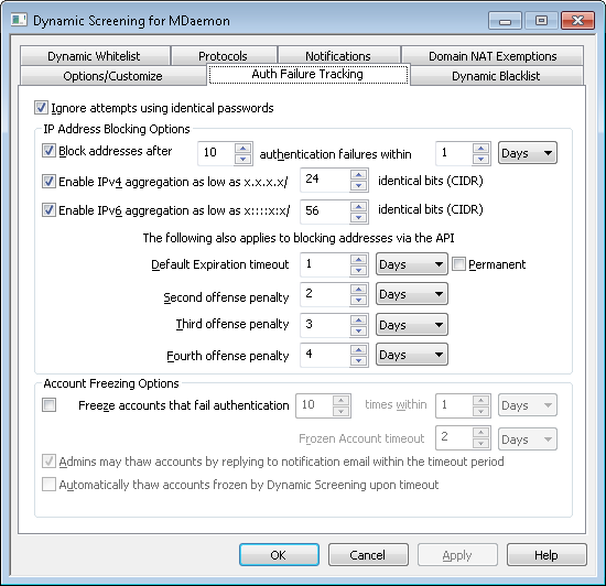 This option applies to the IP Address Blocking Options and to the Account Freezing Options below. By default, when an authentication attempt fails, subsequent authentication attempts will be ignored when using the same password. They will not count against the number of failures allowed before blocking the IP address or freezing the account. Multiple attempts using the same, incorrect password typically occur when, for example, the user's email password has changed or expired and their client is automatically attempting to log in using the old one.