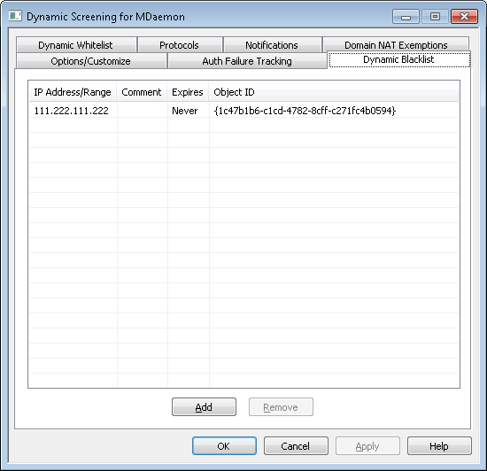 The Dynamic Blacklist contains the list of IP addresses or address ranges that will be blocked by the Dynamic Screening service when they attempt to connect to MDaemon. Addresses can be added automatically by the Auth Failure Tracking and SMTP Screen options, and added manually by clicking the Add button. Each entry contains the IP address or range, the date and time that the entry will expire (or "Never," if it won't expire), any comment that you wish to make about the entry, and an Object ID.