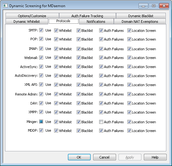 By default the Dynamic Screening service is applied to the following protocols: SMTP, POP, IMAP, Webmail, ActiveSync, AutoDiscovery, the Management API, MDaemon Remote Administration. WebDAV and CalDAV, XMPP, and Minger. Use the options on the Protocols tab to determine which protocols will have their inbound sessions checked against the Dynamic Whitelist and Dynamic Blacklist, which will have their authentication failures tracked, and to which Location Screening will apply. By default all options on this dialog are enabled except for Minger Auth Failures.