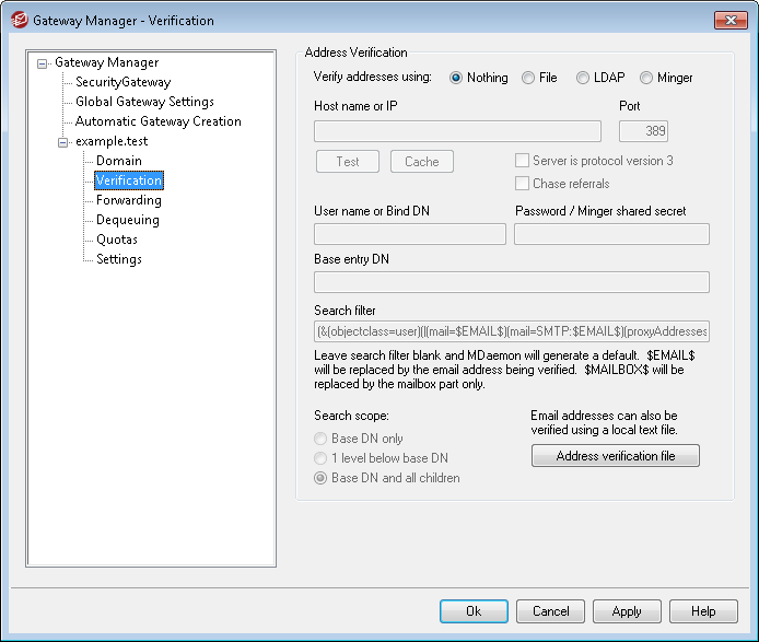 MDaemon contains a method to prevent this by verifying the recipient addresses. If the remote domain's server is configured to keep an LDAP or Active Directory server up to date with all of its mailboxes, aliases, and mailing lists, or if it runs a Minger server to provide remote address verification, then you can use the options on this screen to specify the LDAP, Active Directory, or Minger server where this information is stored. Then, when a message arrives for example.com, you can lookup the recipient's address on the other server and discover whether or not it is valid.
